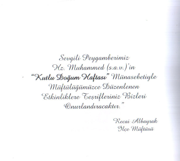Müftü Albayrak ayrıca; Karadeniz Ereğli'de 14-20 Nisan tarihleri arasında kutlanacak olan Kutlu Doğum Haftası nedeniyle tüm vatandaşları;" Sevgili Peygamberimiz Hz. Muhammed (S.A.V)'in "Kutlu Doğum Haftası " nedeniyle Karadeniz Ereğli İlçe Müftülüğü'müzce düzenlenen etkinliklere teşrifleriniz bizleri onurlandıracaktır "dedi.