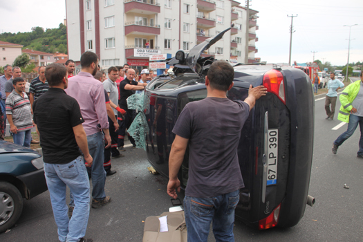 Zonguldak'ın Ereğli ilçesinde tüp aracına çarpan otomobil takla attı. Sürücü, sağlık ekiplerinin ambulanstan getirdiği çekiç ile aracın ön cam kırılarak çıkartıldı. Takla atan otomobile çarpan bir başka otomobilde de maddi hasar meydana geldi.