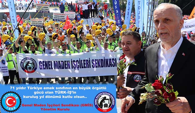 Genel Maden İşçileri Sendikası (GMİS) Yönetim Kurulu, TÜRK-İŞ’in kuruluşunun 71’inci yılı nedeniyle bir açıklama yaparak, “Üyesi olmaktan onur ve gurur duyduğumuz TÜRK-İŞ, 71 yıl önce olduğu gibi bugünde aynı kararlılıkla işçi sınıfının hak ve menfaatleri için mücadelesini sürdürmektedir.” denildi.