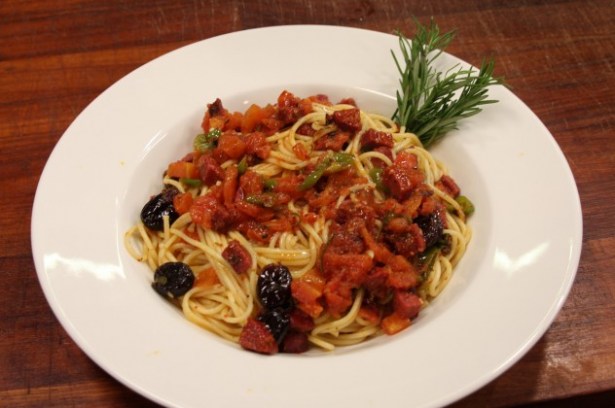 * Sivri biberi incecik, sucukları incecik doğrayın, zeytinlerin çekirdeklerini çıkartın