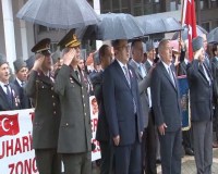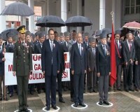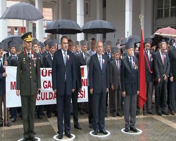 törende protokole şemsiye tutulurken Gaziler Derneği Başkanı Ramazan Çakal ise