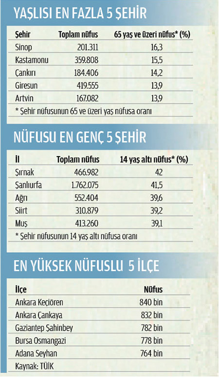 Toplam nüfus içindeki yaşlı nüfusun oranı da giderekartıyor. Türkiye nüfusunun yüzde 7,5'i, 65 yaş ve üzeri grupta. Bu oran2008'de yüzde 6,8 idi. Göç veren Karadeniz, yaşlı nüfusuyla öneçıkarken, doğum hızının yüksek olduğu Güneydoğu ve Doğu Anadolu'da gençnüfus yoğunlukta. En yaşlı nüfusa sahip ilk 5 ilden 4'ü Karadeniz'in göçveren şehirleri. En genç nüfusa sahip 5 ilden ise 3'ü Güneydoğu, 2'siDoğu Anadolu'da.
