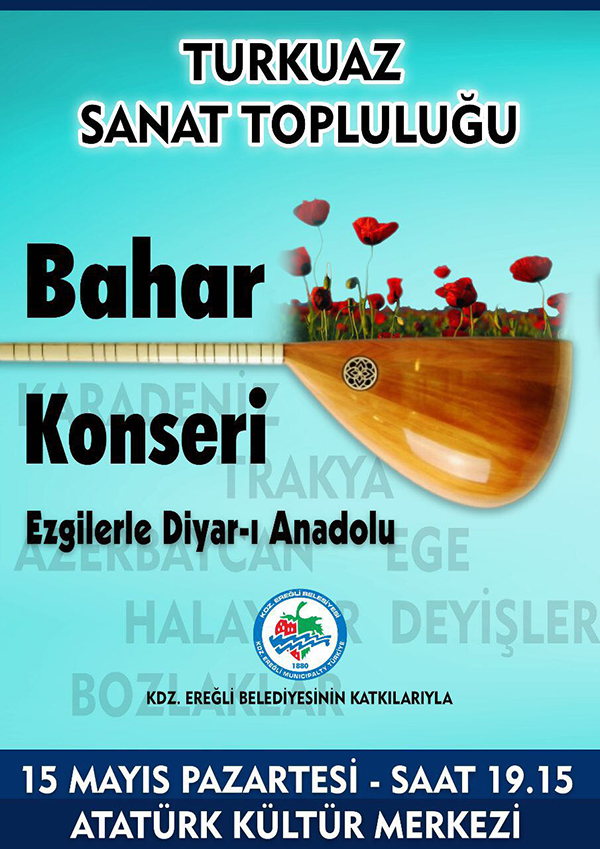 Turkuaz Sanat Topluluğu Başkanı Cihangir Bilgin rehberliğinde faaliyet gösteren Turkuaz Sanat Topluluğu, Karadeniz Ereğli'de kamu yararına gönüllü etkinlikler gerçekleştiriyor. Bu kapsamda çeşitli etkinliklerle kamuoyu karşısına çıkan topluluk bu kez de Ereğli Belediyesi'nin desteğiyle, "Ereğlililerle Diyar-ı Anadolu" konseri verecek. Topluluk üyeleri tarafından verilecek Bahar Konseri 15 Mayıs Pazartesi günü saat 19.15'te Atatürk Kültür Merkezinde sahnelenecek.