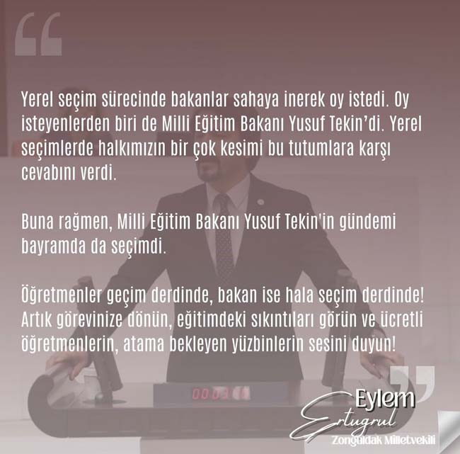 Yerel seçim sürecinde bakanlar sahaya inerek oy istedi. Oy isteyenlerden biri de Milli Eğitim Bakanı Yusuf Tekin’di. Yerel seçimlerde halkımızın bir çok kesimi bu tutumlara karşı cevabını verdi. Buna rağmen, Milli Eğitim Bakanı Yusuf Tekin'in gündemi bayramda da seçimdi. Öğretmenler geçim derdinde, bakan ise hala seçim derdinde. Artık görevinize dönün, eğitimdeki sıkıntıları görün ve ücretli öğretmenlerin, atama bekleyen yüzbinlerin sesini duyun!” dedi