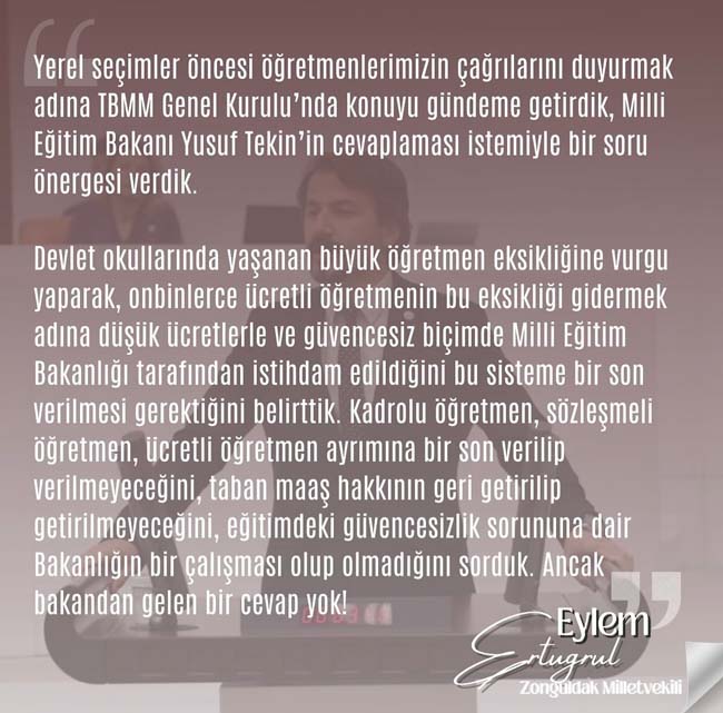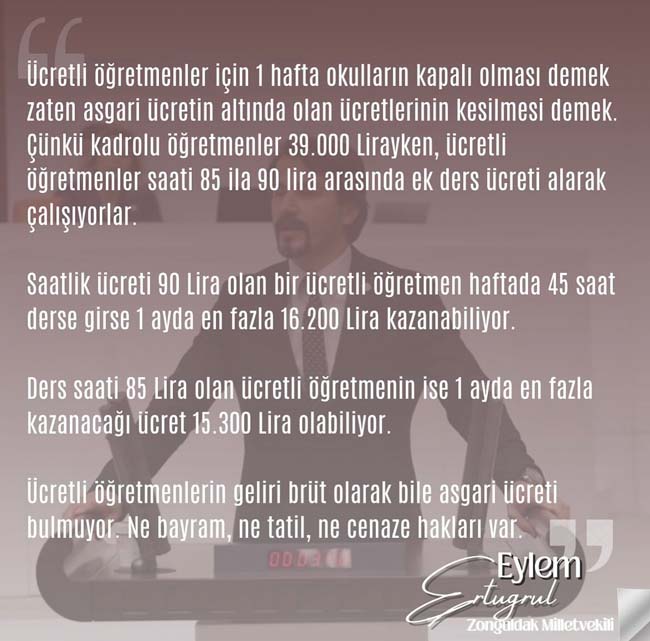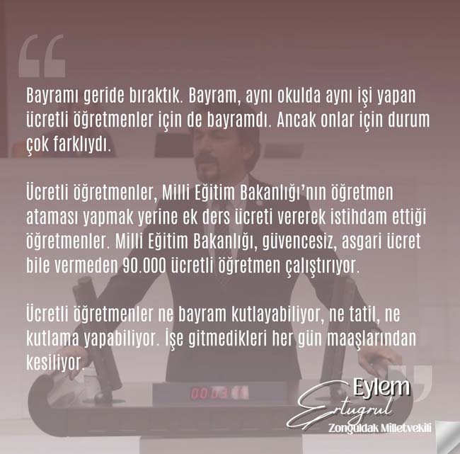 CHP Zonguldak Milletvekili Eylem Ertuğrul,ücretli öğretmenlerin sorunlarını bir kez daha gündeme getirirken, açıklamasında şu görüşlere yer verdi;
