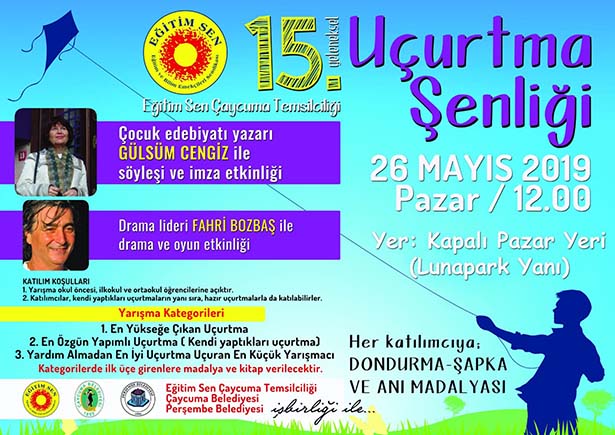 Eğitim Sen Çaycuma Temsilciliği tarafından her yıl düzenli olarak yapılan geleneksel uçurtma şenliğinin 15'incisi Çaycuma Kapalı Pazar Yeri ( Luna Park Yanı) 'nda yapılacak olan şenlik saat 12.00'de başlayacak.