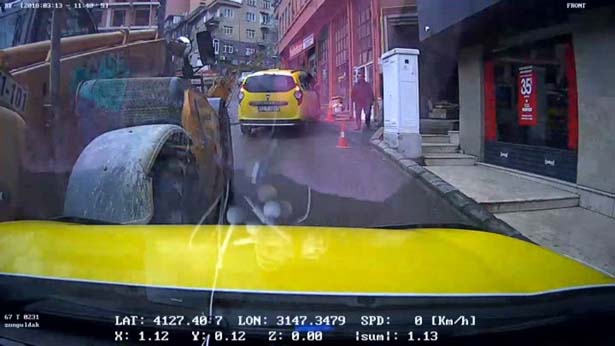 Ticari taksinin güvenlik kameralarına yansıyan görüntülerde ise yolcu ve şoför korku dolu anlar yaşadı. Üç araca çarptıktan sonra ticari taksiye çarparak durabilen iş makinesi şoförü hakkında soruşturma başlatıldı. Öte yandan meydana gelen kaza nedeniyle şehirde trafik kısa süreli durdu.