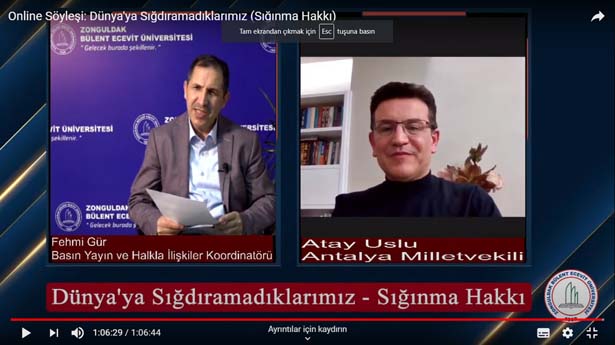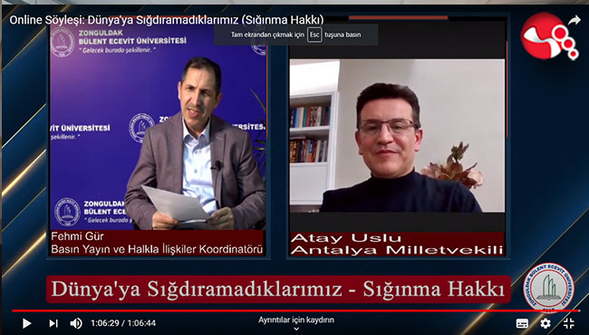 Antalya AK Parti Milletvekili ve TBMM Göç ve Uyum Komisyonu Başkanı Atay Uslu, Bülent Ecevit Üniversitesi’nde düzenlenen ‘Dünyaya Sığdıramadıklarımız’ (Sığınma Hakkı) başlıklı online söyleşiye katıldı.