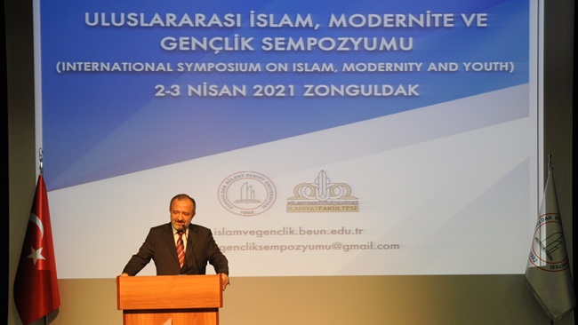 Bülent Ecevit Üniversitesi Rektörü Prof. Dr. Mustafa Çufalı da konuşmasında, modernizmin kısa tarihçesine değinerek, geçmiş dönemlerden günümüze kadar geçen sürede genç neslin yaşadığı gelişim ve dönüşüme ilişkin örnekler verdi. Çufalı, “Modernizm ve gençlik kavramlarının birbirleri ile olan etkileşimlerinin inanç, yaşam tarzı ve değerler üzerinde önemli etkileri var. İçinde bulunduğumuz iletişim ve teknoloji çağında dini ve insani değerlerin yaşatılması önemli Teknolojinin en önemli hedef kitlesini oluşturan gençlerimize gelenekler, değerler ve inançların modernizmin yıkıcı etkilerine karşı farkında olmaları uyarıyoruz. Gençliğe doğruluğun, gerçeğin ve insani değerlerin izinden ayrılmamaları ve bu prensiple gelecek nesillere de örnek olmaları tavsiyesinde bulunarak, sempozyumun gerçekleştirilmesinde emeği geçenlere teşekkür ediyorum” dedi.
