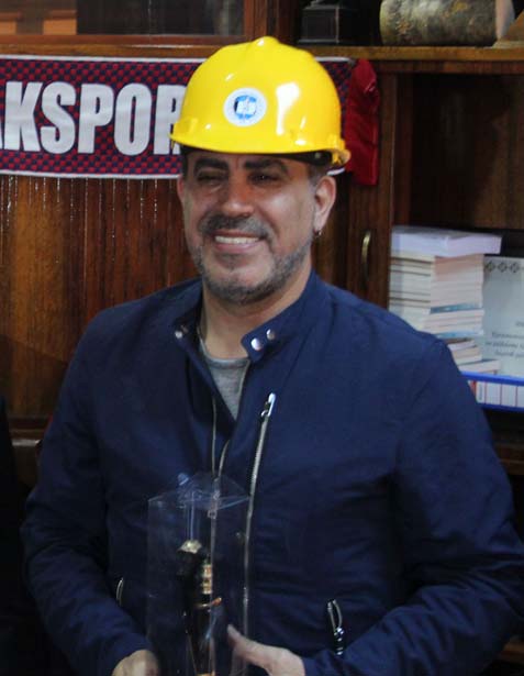 Demirci, Haluk Levent'e üzerinde ismi yazılı bir madenci heykeli, Kabasakal ise bir madenci bareti hediye etti.