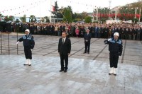 Törende saygı duruşunda bulunuldu, İstiklal Marşı söylenirken bayraklar yarıya indirildi, meşaleler yakıldı.