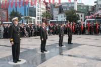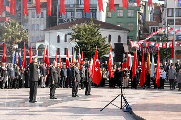 Törende Kaymakam Çorumluoğlu, Bölge Komutanı Tuğamiral Yazıcıoğlu, Belediye Başkanı Uysal ve Türkiye Harp Malulü Gaziler Şehit Dul ve Yetimleri Derneği Ereğli Şube Başkanı Mehmet Ali Demirdüyen tarafından Atatürk Anıtı'na çelenkler sunuldu, saygı duruşunda bulunuldu, İstiklal Marşı söylendi. Asker, bu sırada göndere 3 Türk Bayrağı çekti.