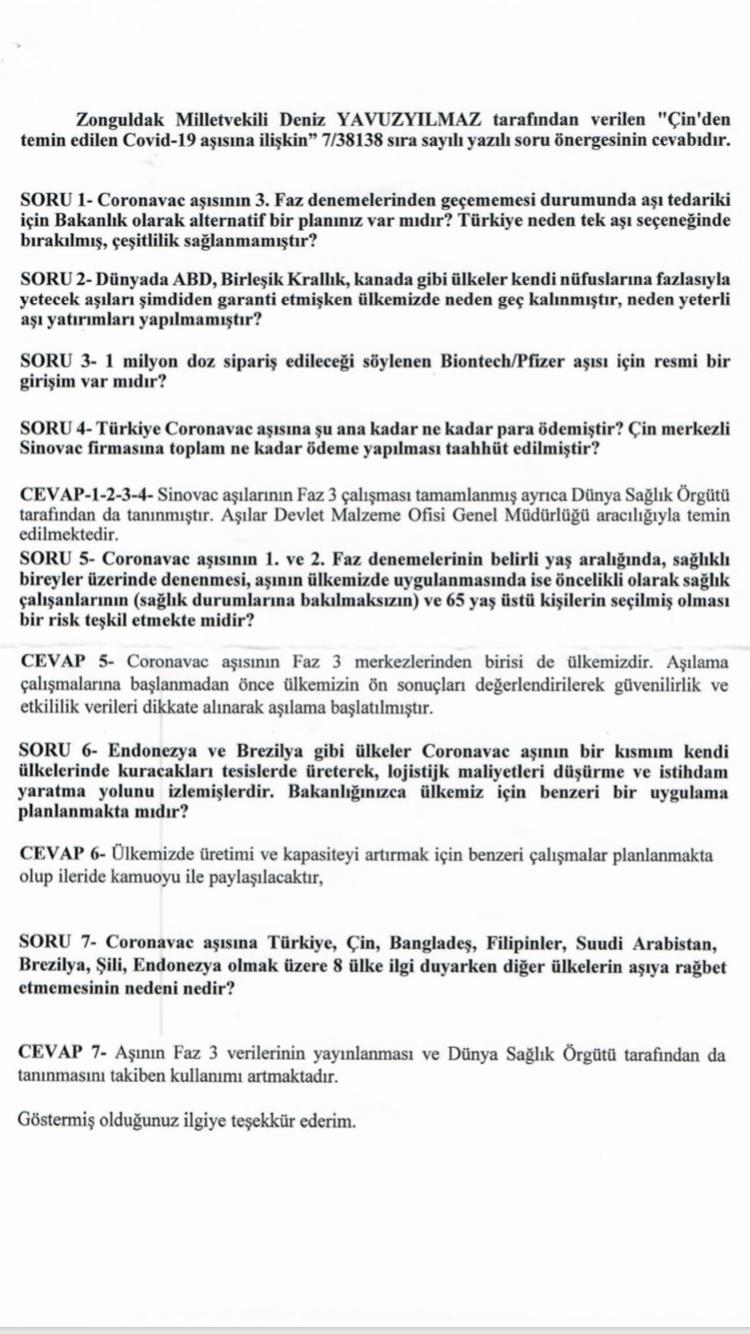 Diğer yandan yakın bir zamanda Sinovac firmasının Endonezya, Brezilya, Malezya ve Mısır'dan sonra Türkiye’ye de aşıyı ülkemizde üretme konusunda lisans verdiğini öğrenmiş, bu nedenle Sağlık Bakanlığına yapmış olduğum bir başvuru ile planlanan Sinovac üretim tesisinin Zonguldak’a kurulması konusunda talebimizi iletmiş bulunmaktayım.