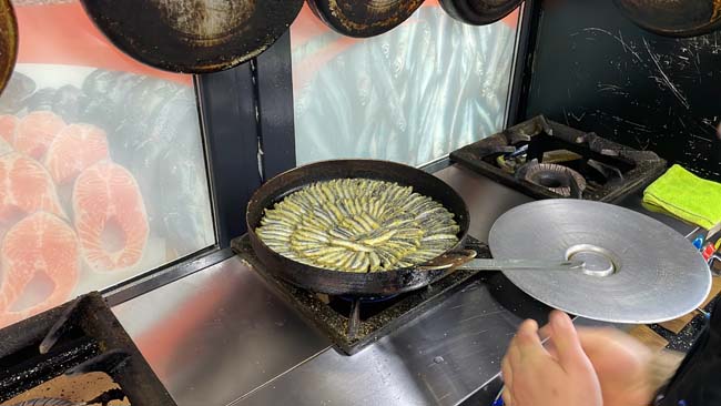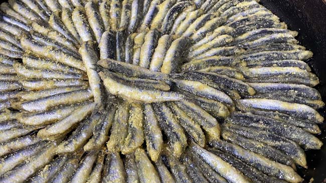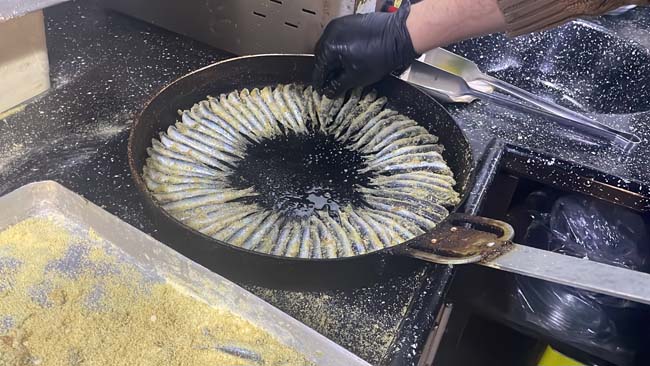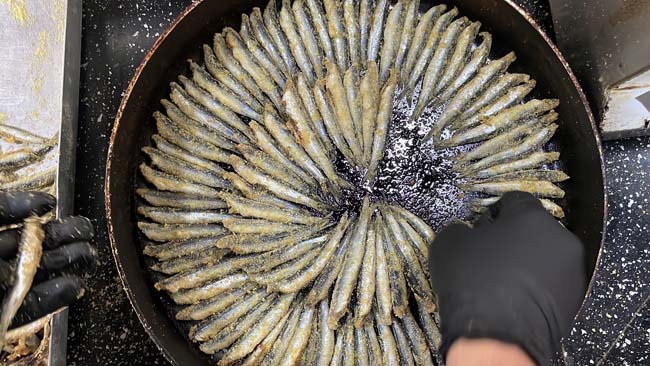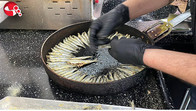 Hamsinin canının az olduğunu, 4 dakikada pişebildiğini dile getiren Balıkçı Özer, “Hamsi tavaya tek tek sıralı bir şekilde dizilir. Herhangi bir ince ayrıntısı yok bunun. Tamamen el becerisi olması gerekiyor. Hamsilerin her biri aynı tarafa baktığı zaman tavaya dizdiğinizde yuvarlak şekle geliyor zaten. Hamsi 4 dakikada pişen bir balık. Ateş aşırı harlı olmaması lazım. Harlı olduğu zaman dışı yanar hamsinin. Bu balığın canı az. Ateşi orta seviyede olması gerekiyor. Hemen ve çabuk pişebilen bir balık. Hamsi pişirirken tavası çok önemli. Her tavada olmaz. Bol yağ atılmaması lazım. Kendi yağı vardır. Az mısır unu ile çok daha lezzetli olur. Kendi suyu ve kendi yağı kaybolmaması lazım” şeklinde konuştu.