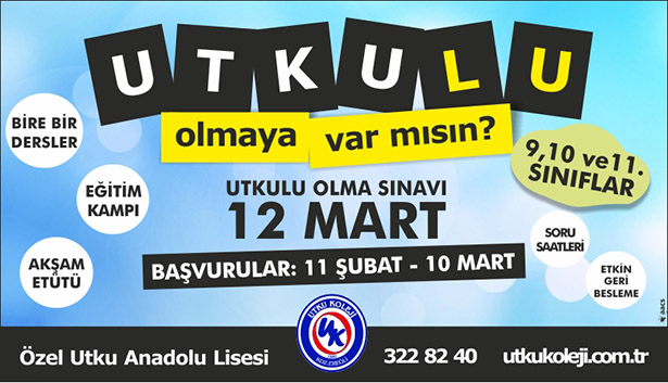 "Utku'lu olmaya var mısın?12 Mart'ta yapılacak olan bursluluk sınavına katılarak bu ayrıcalığı yaşayabilir. Zengin sosyal aktivite, verimli, etkili, akademik ve rehberlik çalışmalarıyla buluşma şansını yakalayabilirsiniz.