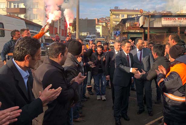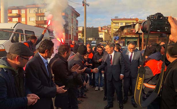 Karadeniz Ereğli Belediyesi temizlik işçileri tarafından şantiyede konfeti, meşale ve 'En büyük başkan bizim başkan' sloganları ile karşılan Kdz. Ereğli Belediye Başkanı Hüseyin Uysal, sıcak karşılamaya ve heyecana teşekkür etti.