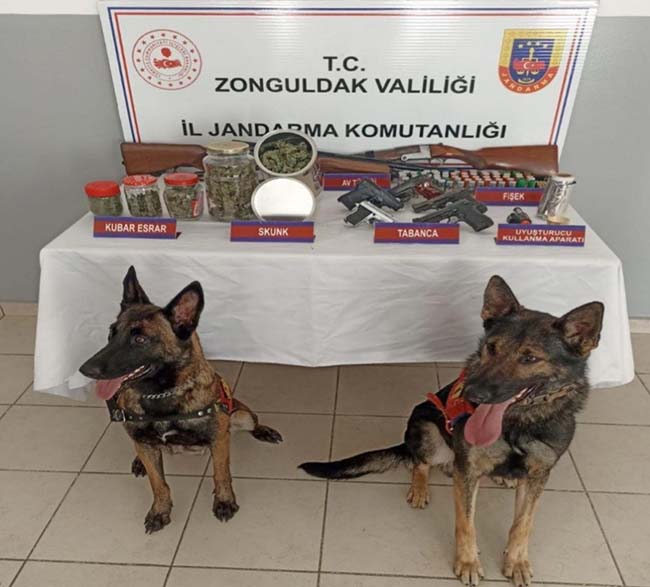Edinilen bilgiye göre Zonguldak İl Jandarma Komutanlığı ekipleri, Devrek ilçesinde bir eve yönelik operasyon düzenledi. İlgili makamlardan alınan izinle belirlenen evde geniş çaplı arama yapıldı. Yapılan aramada; 1.575 gram skunk, 1.104 gram kubar esrar, 1 adet esrar öğütme aparatı, 5 adet ruhsatsız tabanca, 2 adet ruhsatsız av tüfeği, 34 adet tabanca fişeği, 67 adet av tüfeği fişeği ele geçirildi.