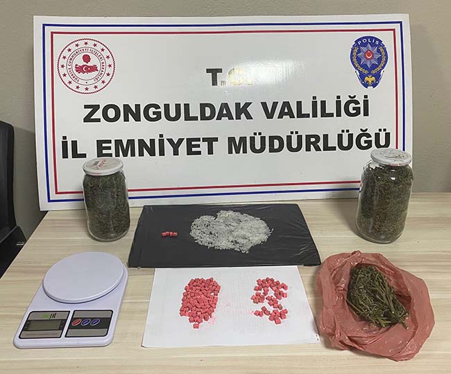 - O.İ isimli şüpheli şahsın üzerinde ve ikametinde yapılan aramada; (30) gram metamfetamin maddesi, (370) gram esrar maddesi, (146) adet extacy hap, 1 adet hassas terazi ve suçtan elde edilen 770 TL para ele geçirildi.