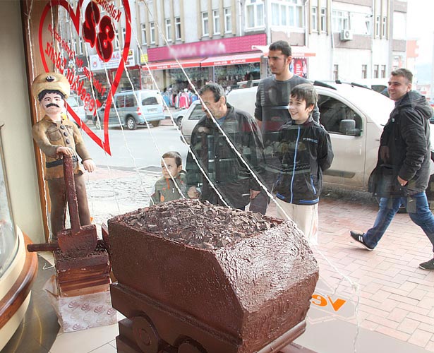 Kdz. Ereğli'de kömürü bulan Uzunmehmet'in pastası yapıldı. Pastanın 1 hafta sergide kalacağı, daha sonra halka ikram edileceği bildirildi.