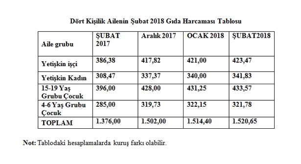 Genel Maden İşçileri Sendikası'nın Zonguldak'ta yaşayan 1 çalışan, 1 ev hanımı 2 çocuklu toplam dört kişiden oluşan çekirdek ailenin aylık gıda harcaması Şubat 2018'de bir önceki aya göre yüzde 0.54 oranında arttı. Zonguldak'ta yaşayan 4 kişilik ailenin gıda harcaması 1520,65 liraya yükseldi. Yeni rakamlarla Yoksulluk Sınırı aylık 21 TL artış ile 3.901,00 TL oldu.