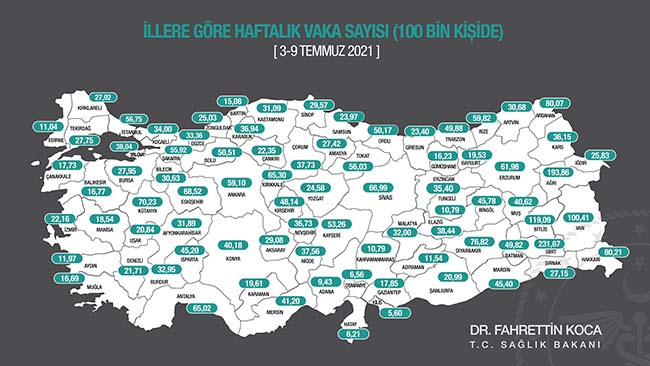 Sağlık Bakanı Fahrettin Koca, 10-16 Temmuz'da illere göre her 100 bin kişide görülen Kovid-19 vaka sayılarını açıkladı.
