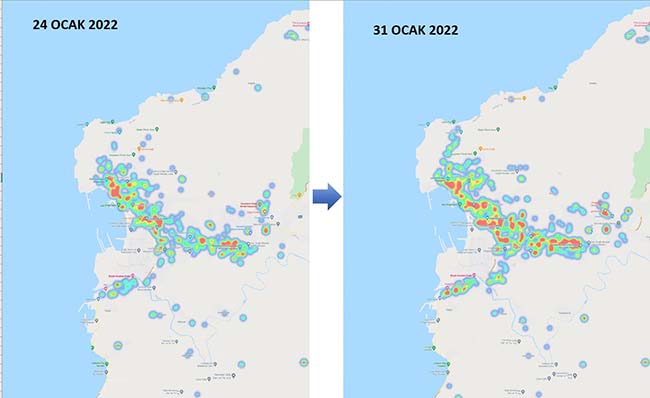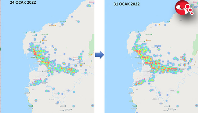 Hayat Eve Sığar uygulamasına bakıldığında bir önceki haftaya oranla yayılım hızının en çok arttığı bölgeler Çarşı merkezi, Gülüç Beldesi ile Bağlık, Kavaklık ve Kepez Mahalleleri.