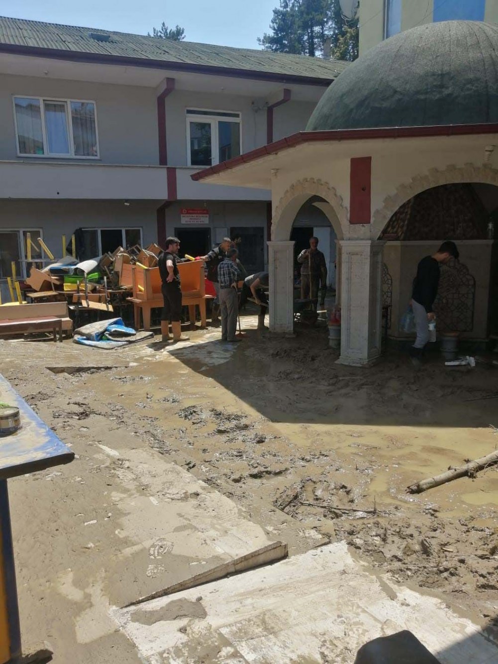 Zonguldak'ın Beycuma beldesinde sel sularıyla kaplanan Merkez Cami'de temizlik çalışmaları sürüyor. Temizlik çalışmalarına katılmak üzere beldeye gelen AFAD gönüllüsü, vakit ezanını okudu.