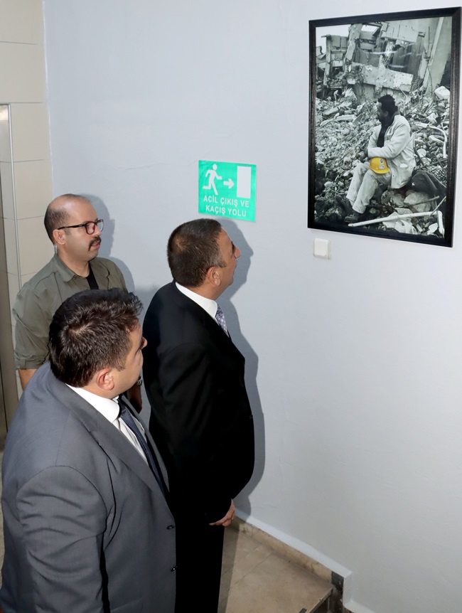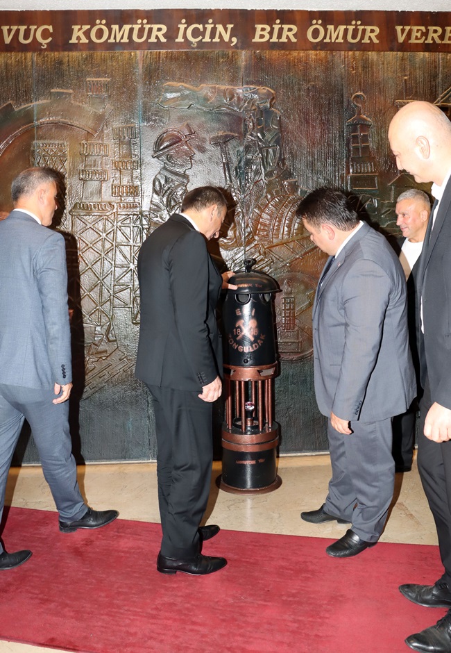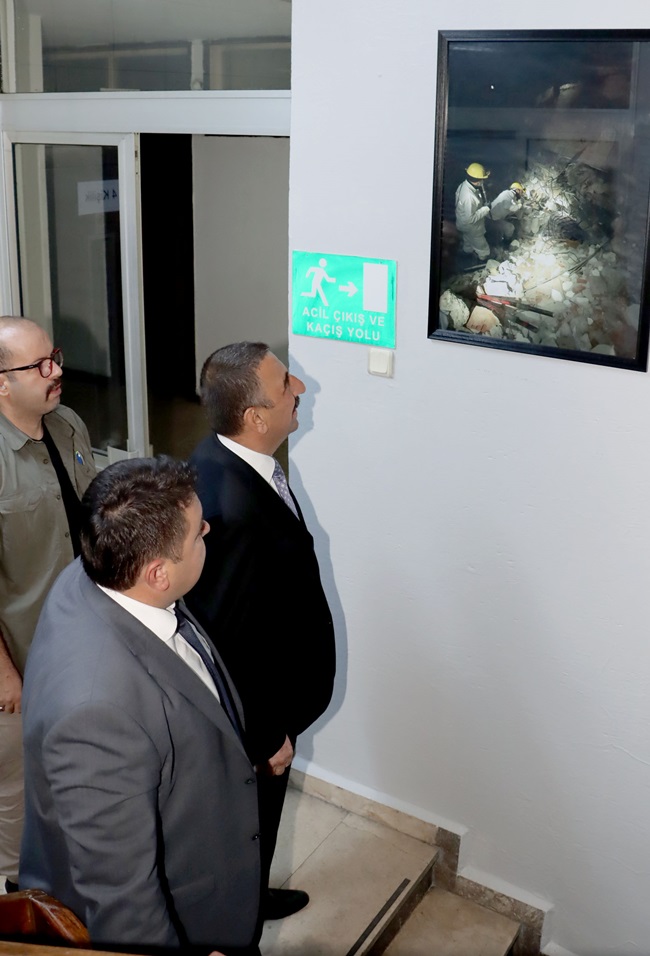Ziyaret çıkışında GMİS binasında sergilenen simgesel madenci feneri ile maden ve MTA işçilerinin çalışmalarının ve deprem bölgesindeki kahramanlıklarının yansıdığı fotoğrafları inceleyen Vali Osman Hacıbektaşoğlu’na GMİS Genel Başkanı Hakan Yeşil bilgi verdi.