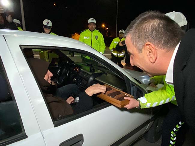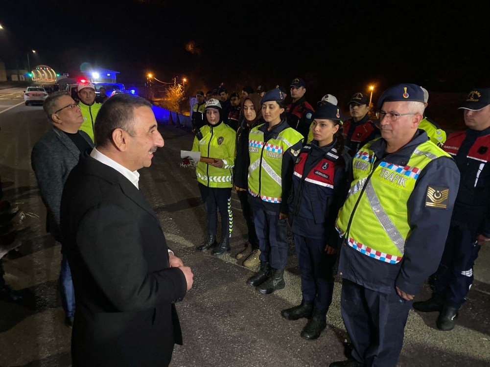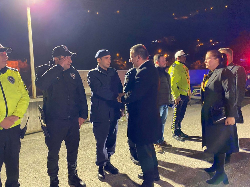Zonguldak Valisi Osman Hacıbektaşoğlu, yeni yıl gecesi ziyaret ettiği uygulama noktasında jandarma ve polis ekipleri ile sürücülere ikramda bulundu.