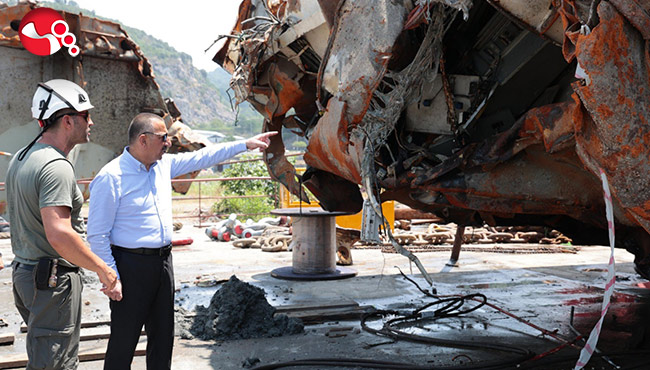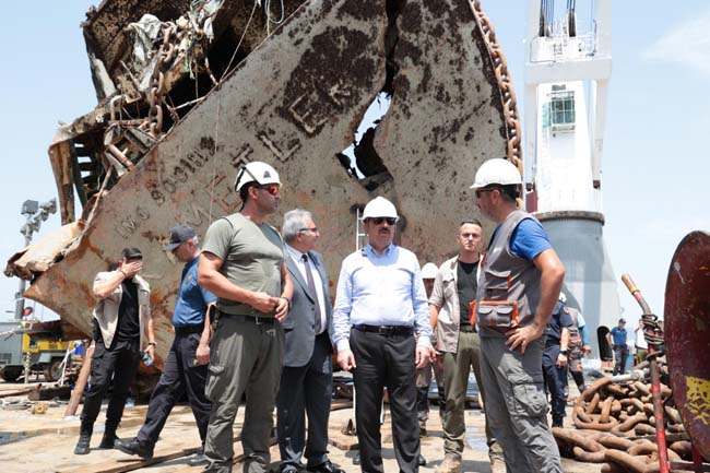 Zonguldak Valisi Osman Hacıbektaşoğlu, Ereğli ilçesine gelerek batan geminin çıkartılan kısmında yapılan çalışmaları yerinde inceledi.