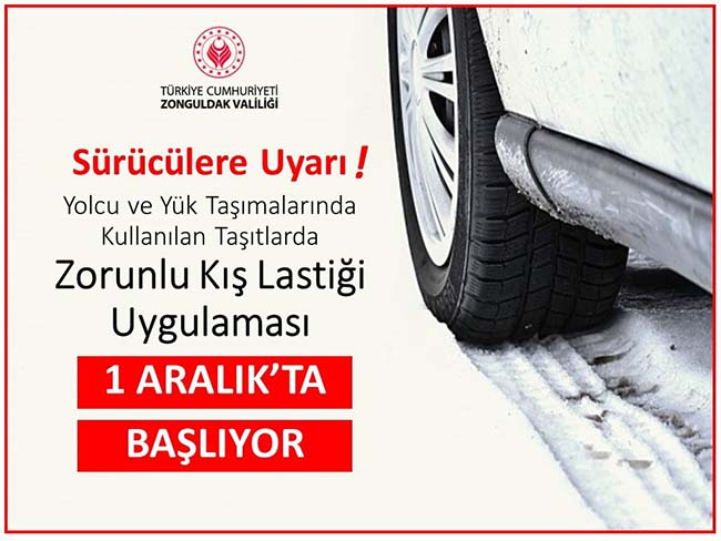 Zonguldak Valiliği, yolcu ve yük taşımacılığında kullanılan araçlar için kış lastiği kullanımının 1 Aralık itibarıyla zorunlu hale geleceğini duyurdu.