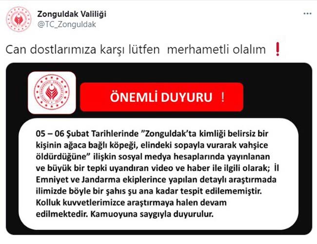 Zonguldak Valiliği, büyük tepki çeken görüntülere ilişkin açıklama yaptı. Açıklamada, “5-6 Şubat tarihlerinde Zonguldak'ta kimliği belirsiz bir kişinin ağaca bağlı köpeği, elindeki sopayla vurarak vahşice öldürdüğüne' ilişkin sosyal medya hesaplarında yayınlanan ve büyük tepki uyandıran video ve haber ile ilgili olarak; il emniyet ve jandarma ekiplerince yapılan detaylı araştırmada ilimizde böyle bir şahıs şu ana kadar tespit edilememiştir. Kolluk kuvvetlerimizce araştırmaya halen devam edilmektedir” denildi.