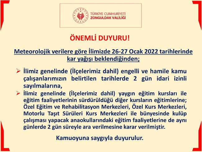 Zonguldak Valiliği, engelli ve hamile kamu çalışanlarının iki gün idari izinli sayılacağını, eğitim çeşitli kurumların da aynı günlerde eğitim faaliyetlerine ara verilmesine karar verildiğini duyurdu.