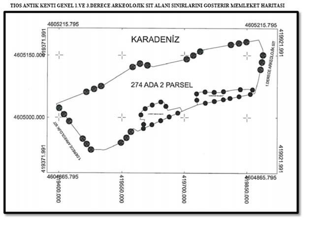 2863 Kanun ve ilgili Yönetmelik kapsamında arkeolojik alanlar kalıntı durumuna göre, 1.derece, 2.derece, 3.derece arkeolojik sit alanı olarak tescil edilmektedir. Söz konusu haberlerde ifade edildiği 1.derece arkeolojik sit alanlarında yer alan Tios Antik Kenti içerisinde yapılaşmaya ilişkin Karabük Kültür Varlıklarını Koruma Bölge Kurulu tarafından verilmiş herhangi bir izin bulunmamaktadır.