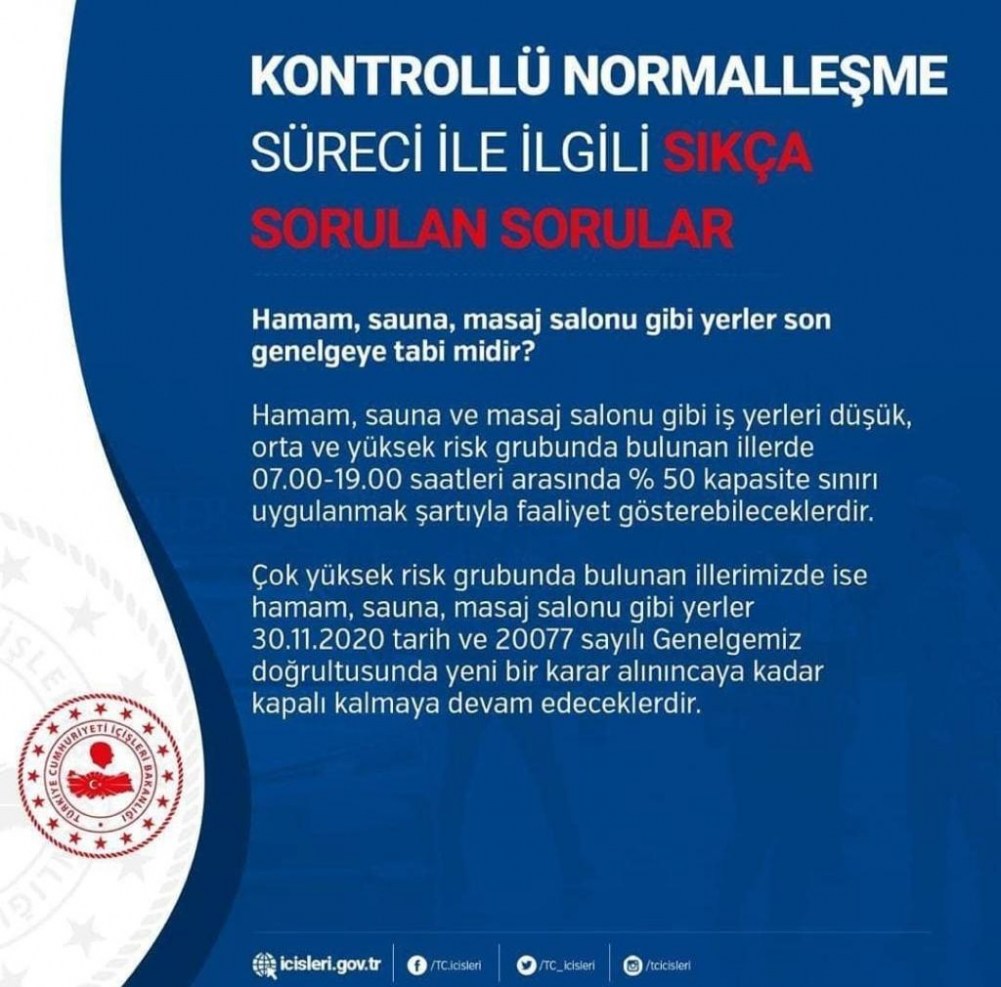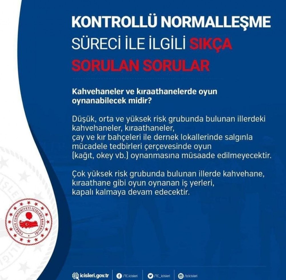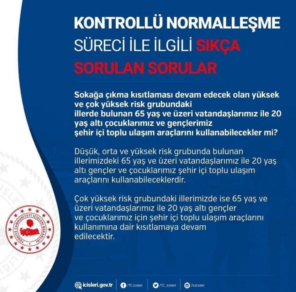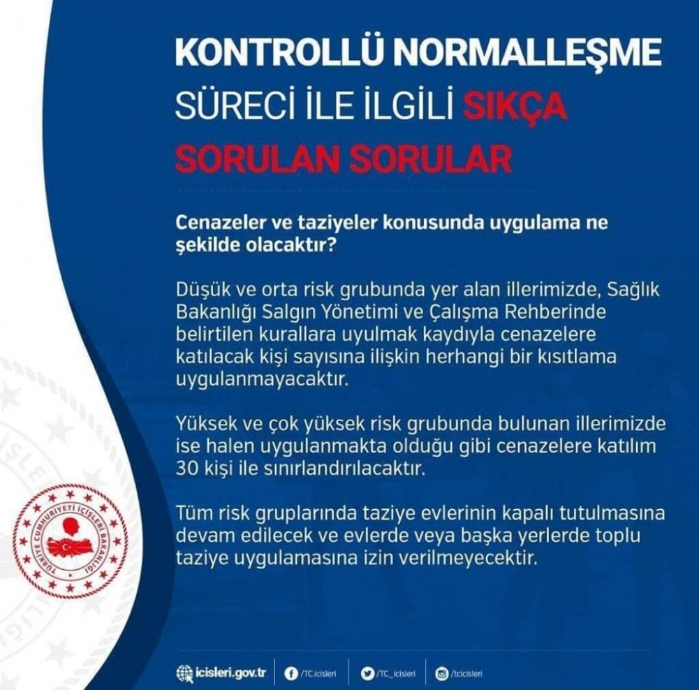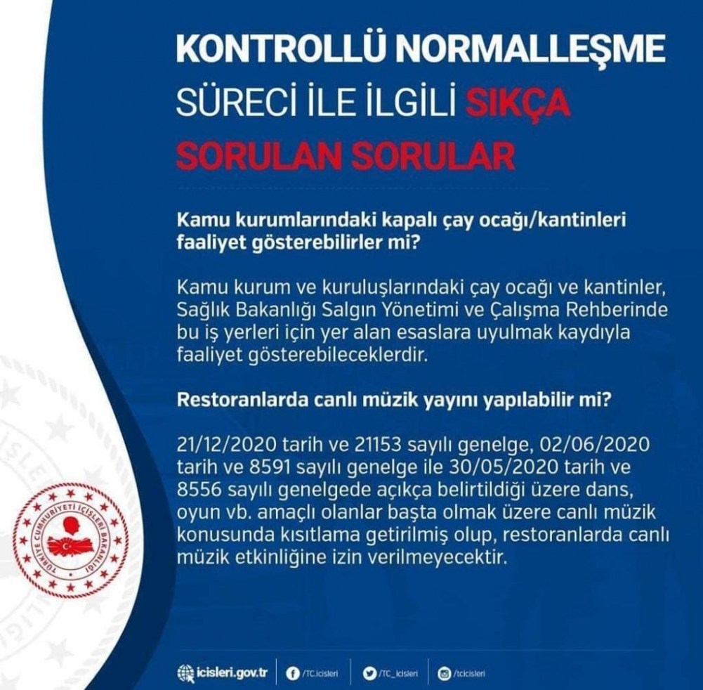 Yapılan açıklamada; “Salgın nedeniyle kontrollü normalleşme dönemindeyiz. Hayatımızın her alanının normalleşmesi için tüm kurallara uymalıyız. Sağlığımız için hepimiz birbirimize karşı sorumluyuz. İnşallah birlikte başaracağız” denildi.