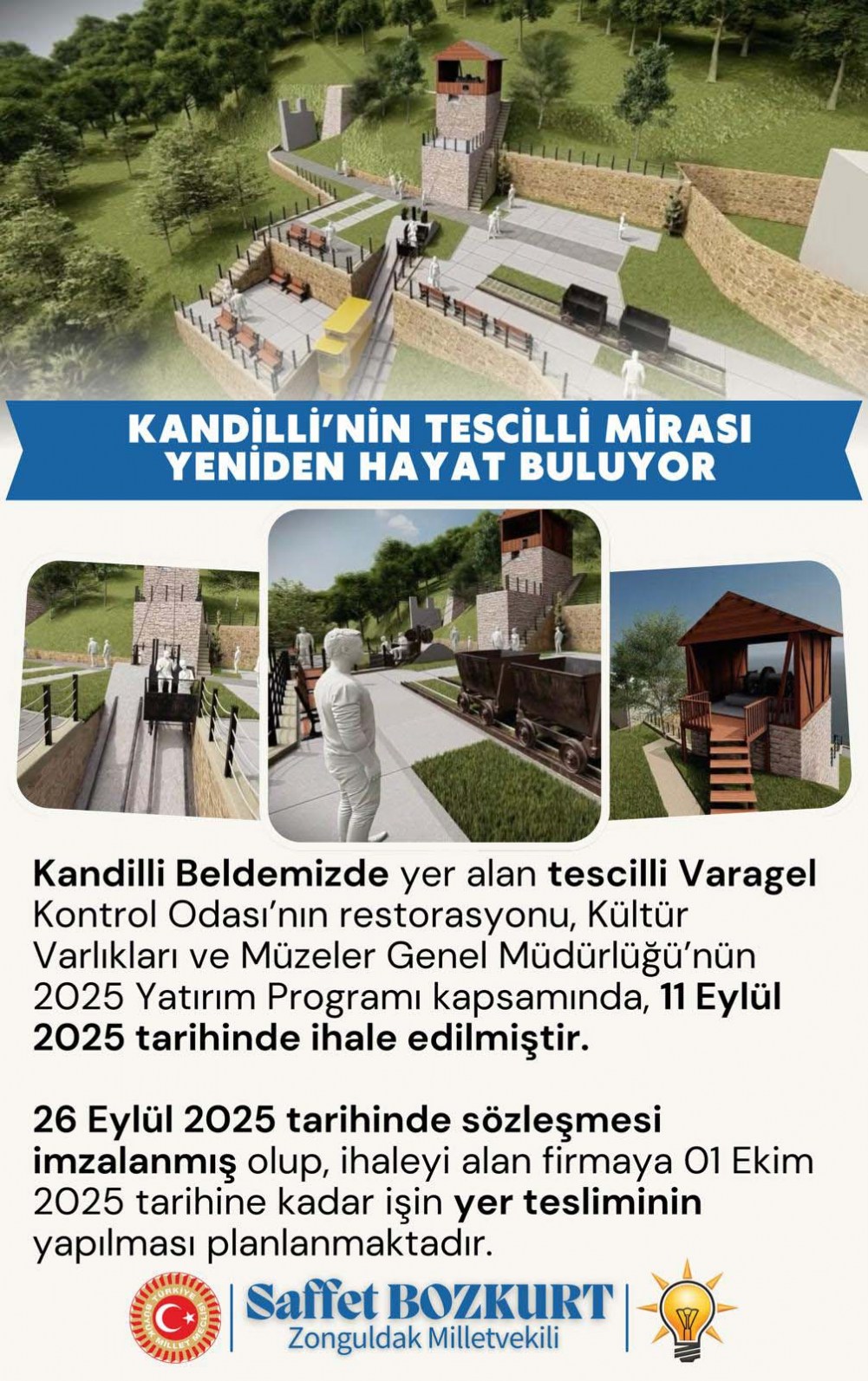 AK Parti Zonguldak Milletvekili Saffet Bozkurt konu hakkında yaptığı açıklamada, Kandilli beldesinde yer alan tescilli Varagel Kontrol Odası’nın restorasyonu için çalışmalar başlıyor. Kültür Varlıkları ve Müzeler Genel Müdürlüğü’nün 2025 Yatırım Programı kapsamında proje, 11 Eylül 2025 tarihinde ihaleye çıkarıldıüını açıkladı.