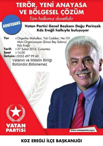 Vatan Partisi Kdz. Ereğli İlçe Başkanı Alev Aksu, parti binasında basın toplantısı düzenledi. Aksu toplantıda Ankara ve Diyarbakır'da yaşanan terör saldırılarını kınayarak, Türkiye'nin bu süreçten bütünleşerek çıkacağını vurguladı. Aksu konuşmasında "Dün yaşanan emperyalist destekli terör saldırısını lanetliyoruz. Türkiye kesin bir kararlılıkla PKK'yı hendeklere gömmektedir. Aynı zamanda Suriye'nin kuzeyinde bir ABD - İsrail koridoru oluşturulmasına karşı Türk milleti birleşmektedir. Bu koşullarda bölücü terör örgütünü Türkiye'nin üzerine süren güçlerin bazı yanıtlar vermesi yaşadığımız sürecin doğasına uygundur. Bu terör eylemleri boşunadır. Türkiye bu süreçten vatan bütünlüğünü gerçekleştirerek çıkacaktır. Bu terör eylemleri milletimizi daha sıkı kenetlenmeye ve daha sıkı bir mücadeleye çağırmaktadır. Artık devlet ve milletçe top yekûn mücadele zamanıdır. Bu kararlılığımızı bir kez daha ifade ederek Türk Silahlı Kuvvetleri'ne ve milletimize başsağlığı diliyoruz" dedi.