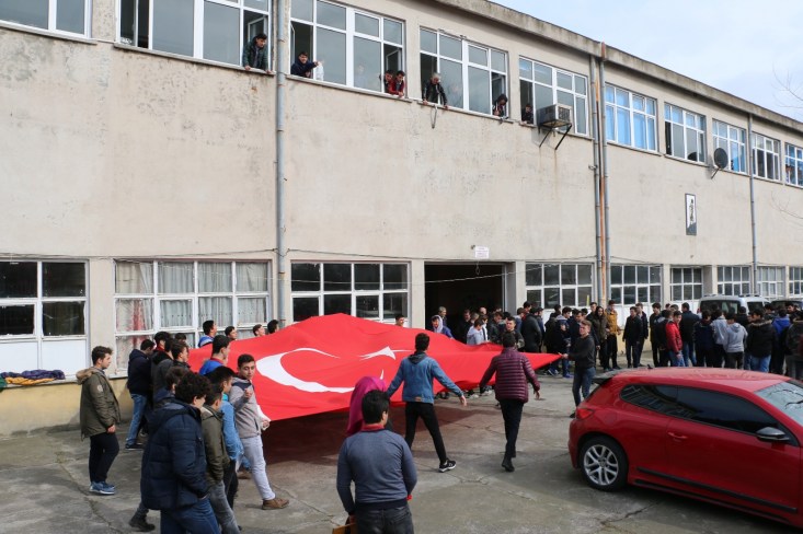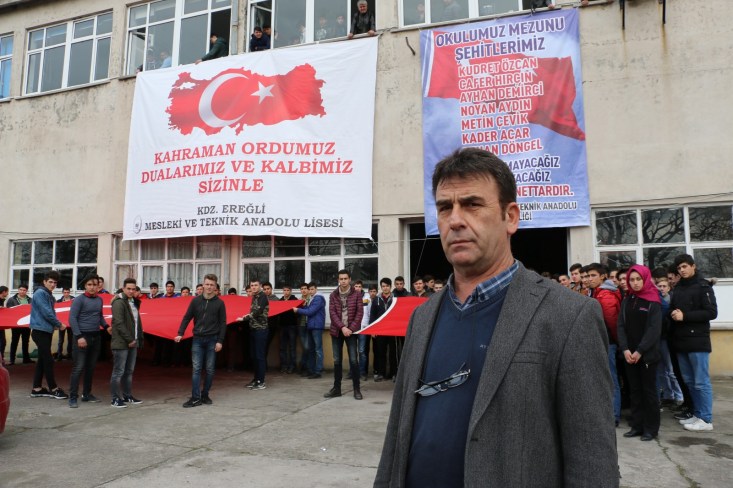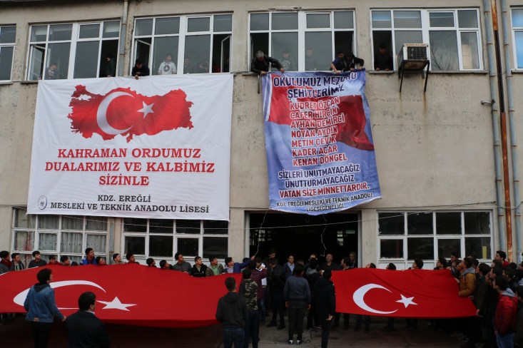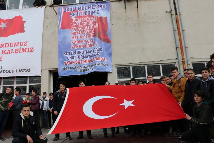 Zonguldak'ın Ereğli ilçesinde mezunlarından bugüne kadar 7 şehit veren Ereğli Teknik ve Endüstri Meslek Lisesi okul yönetimi ve öğrencileri, Afrin'de görev yapan Mehmetçiklere moral vermek amacıyla okul binasına 'Kahraman Ordumuz, dualarımız ve kalbimiz sizinle' yazılı pankart astı. Öğrenciler okul idaresi tarafından yazılan mesajda "Kahraman Ordumuza okumak istediğimiz bir mesaj var. Yolunuz Kızıl elma olsun. Yolunuz yolumuz olsun. Vatana Canımız feda olsun. Hakkımız size helal olsun. Canınız Allah'a emanet olsun" sözleri ile destek verdi.