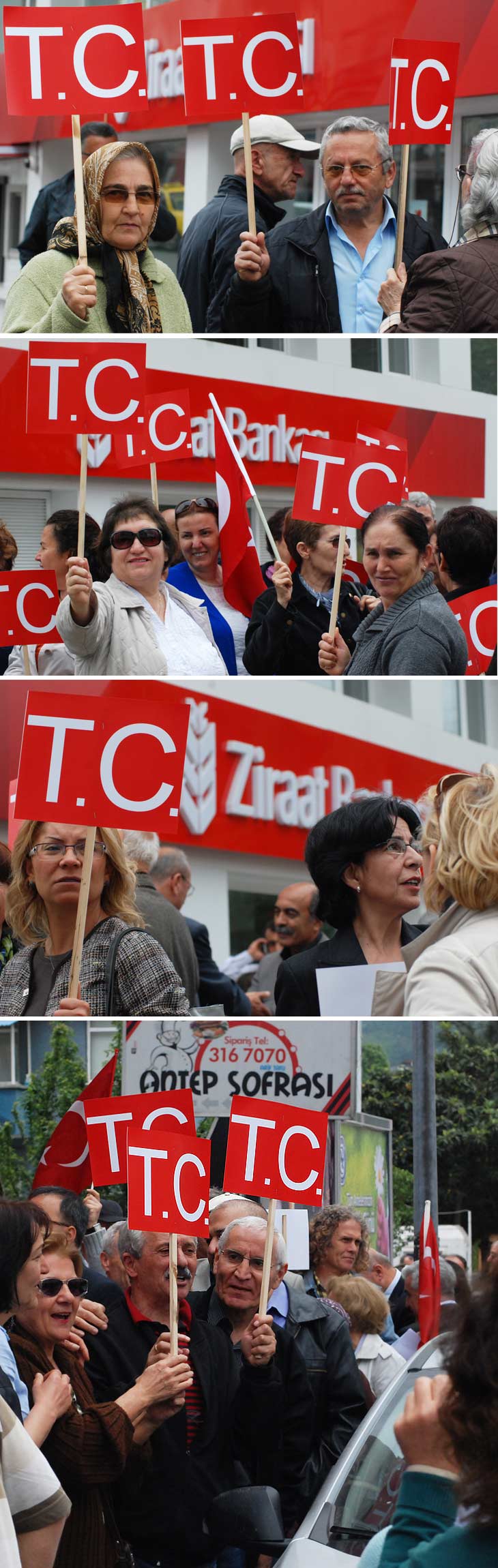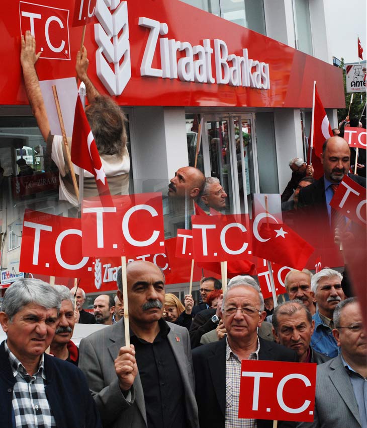 Ziraat Bankası, yaklaşık yüz kişilik bir grubun protestosuyla karşılaştı. Tabelasından T.C harflerini kaldıran banka şubesinin önünde "Ne Mutlu Türküm Diyene" ile "Mustafa Kemal'in Askerleriz" sloganları atıldı. Çevrede ki vatandaşlarda, protesto eylemine destek verdi.