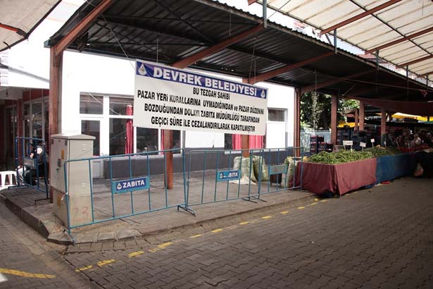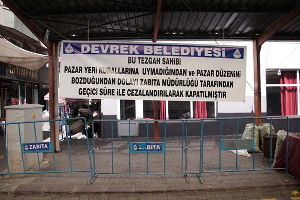 Devrek Belediyesi sebze meyve pazarındaki esnaftan bir kişinin tezgahı, pazar kurallarına uymadığı ve pazar düzenini bozduğu gerekçesiyle, Devrek Belediyesi encümen kararıyla geçici süre ile cezalandırılarak kapatıldı.