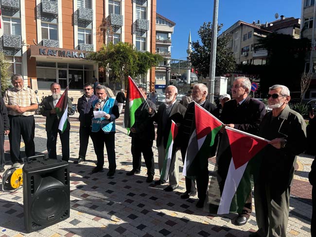 Anadolu Gençlik Derneği öncülüğünde bir araya gelen vatandaşların İsrail’i kınadıkları ortak deklarasyonu vatandaşlar tarafından okundu. AGD Devrek ilçe Başkanı Ramazan Dernek, "Hastane katliamından sonra şehit olan kardeşlerimizi bir kez daha rahmetle anıyorum. Milyonlarca dolar harcanan sistemler, uydular, silahlar ve hepsinden önemlisi yenilemezlik algısı yerle yeksan olmuştur. Filistin'e bizden koparamayacaksınız. İşte biz Aksa için canını vermeye hazır on binler, yüzbinler, milyonlar olarak daima karşınızda olacağız" dedi.