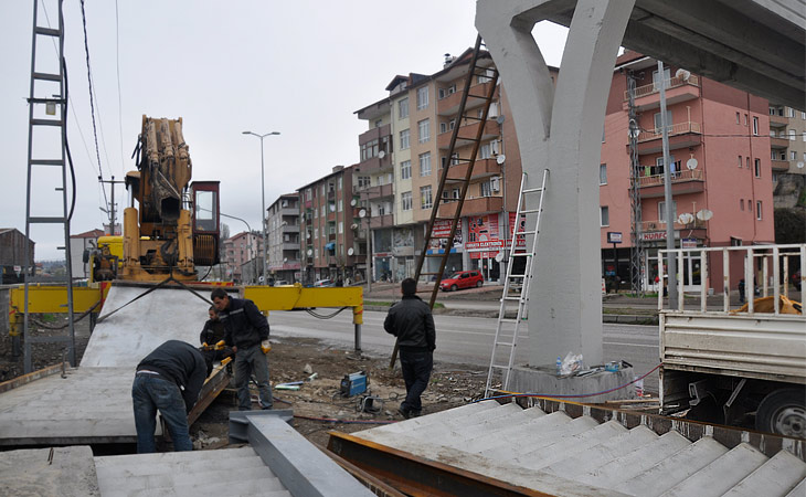 Yeşiltepe-Kepez yolu üzerinde Karayolları Genel Müdürlüğü tarafından yapılan 3 ayrı yaya üst geçidinin merdivenleri monte edilmeye başlandı.