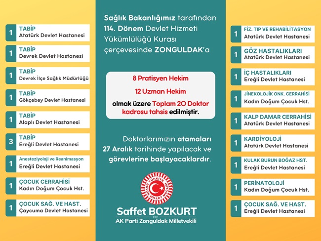 "Sağlık Bakanlığımız tarafından 114. dönem devlet hizmeti yükümlülüğü kurası çerçevesinde ZONGULDAK’a 8 Pratisyen Hekim 12 Uzman Hekim olmak üzere toplam 20 Doktor kadrosu tahsis edilmiştir.