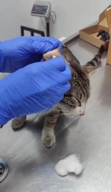 Kediyi içeriye çağıran Olucak, bir süre sevdiği kediye mama verdi. Kedinin mamaya yöneldiği sırada başını eğik tuttuğunu fark eden Olucak, anormal bir durum olduğunu fark edince muayenehaneye getirdi.