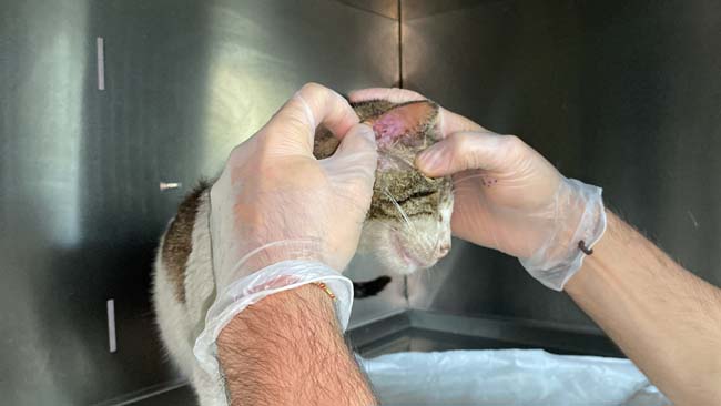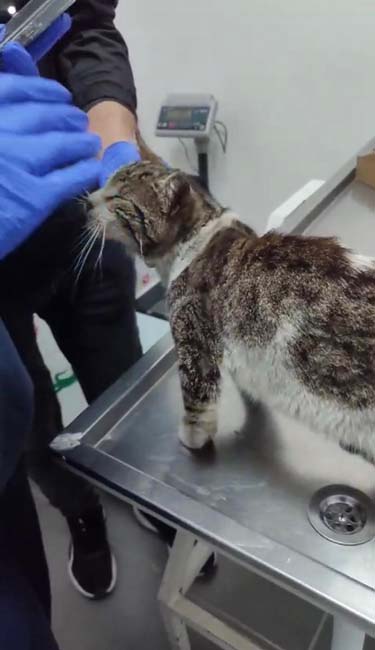 Güvenlik kamerasına saniye saniye yansıyan olayda kedinin tedavi olmak için kendilerine geldiğini anlatan klinik hekimlerinden Fatih Yaman, “Arkadaşımız kendisi tedavisinin yapılacağı kliniği bulup, gelip, bizden yardım isteyen bizim de yardımı geri çevirmediğimiz bir arkadaşımız. Kulağında polip (tümör) sıkıntısı olan bir arkadaş. Polipin cerrahi yolla uzaklaştırılması gerekiyor. İlk amacımız tedaviye bununla başlamak. Eğer tedavimiz bununla beraber olumlu sonuç verirse ekstra başka bir operasyona gerek kalmadan sağlıklı şekilde hayatına devam eder” dedi.