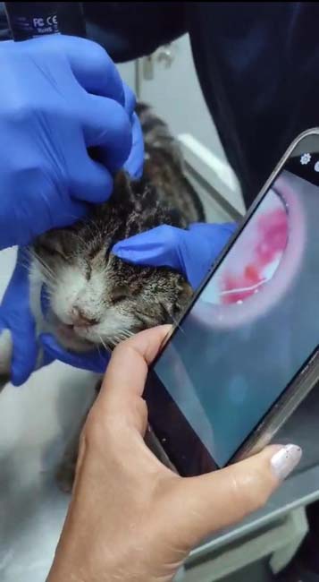 Kedinin kulağından içeriye kamera ile bakan veteriner hekim, kanamalı tümör olduğunu ve sağlık durumunun da ciddi olduğunu fark edince tedavi süreci başlattı.