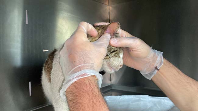 Kedinin; hastalığın etkisiyle beraber başını yan tuttuğuna dikkat çeken Yaman, veteriner hekim Suat Olucak’ın dikkati sayesinde hastalığın teşhis edildiğini belirtti. Yaman, “Bu da bizim karşılaştığımız durumlar. Hasta sağ kulağı tarafına başını yatırarak aslında sağ kulağında sıkıntı olduğunu beden diliyle beraber aktarmaya çalışıyor. Hekimimiz Suat bey bu durumu fark ederek teşhisini koyuyor” dedi.