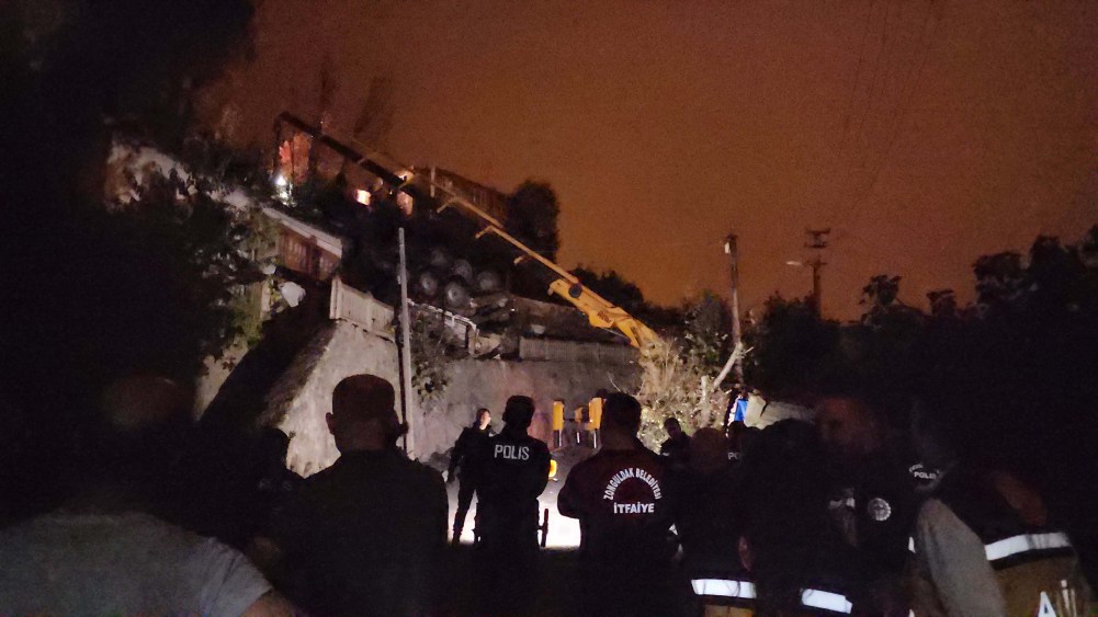 Zonguldak'ta kömür yüklü tır, virajı alamayarak bahçeye uçtu. Kazada ters dönen tırın sürücüsü hayatını kaybeti.