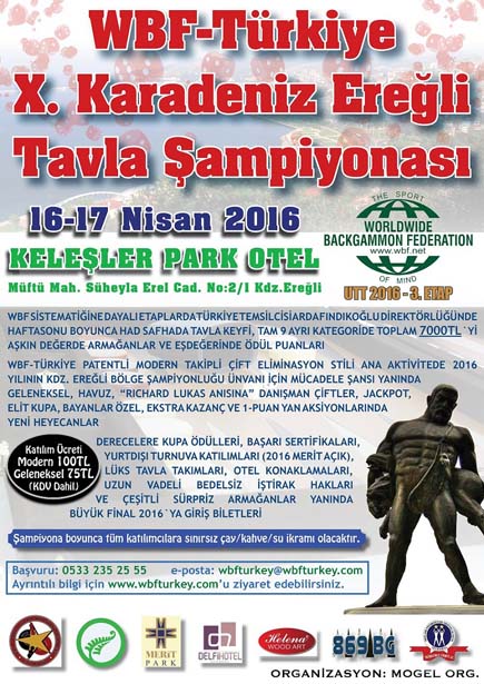 WBF-Türkiye, 2016 Ulusal Tavla Turnuvası Ereğli Temsilcisi Uğur Duru WBF Türkiye 2016 Ulusal Tavla Turnuvası üçüncü Etabını Kdz. Ereğli'de gerçekleştireceklerini belirtti.