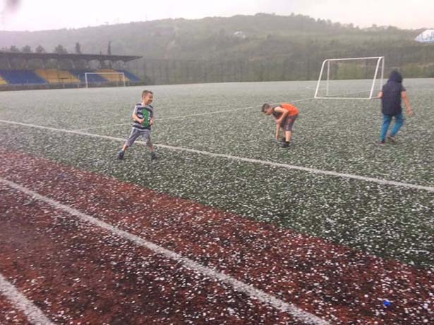 Zonguldak'ın Alaplı ilçesinde aniden bastıran sağanak yağış ve dolu yağışı hayatı olumsuz etkiledi. Köylerde de dolu yağışı etkili olurken, çocuklar dolu yağışı ile birlikte sokağa çıkarak o anların keyfini yaşadı.